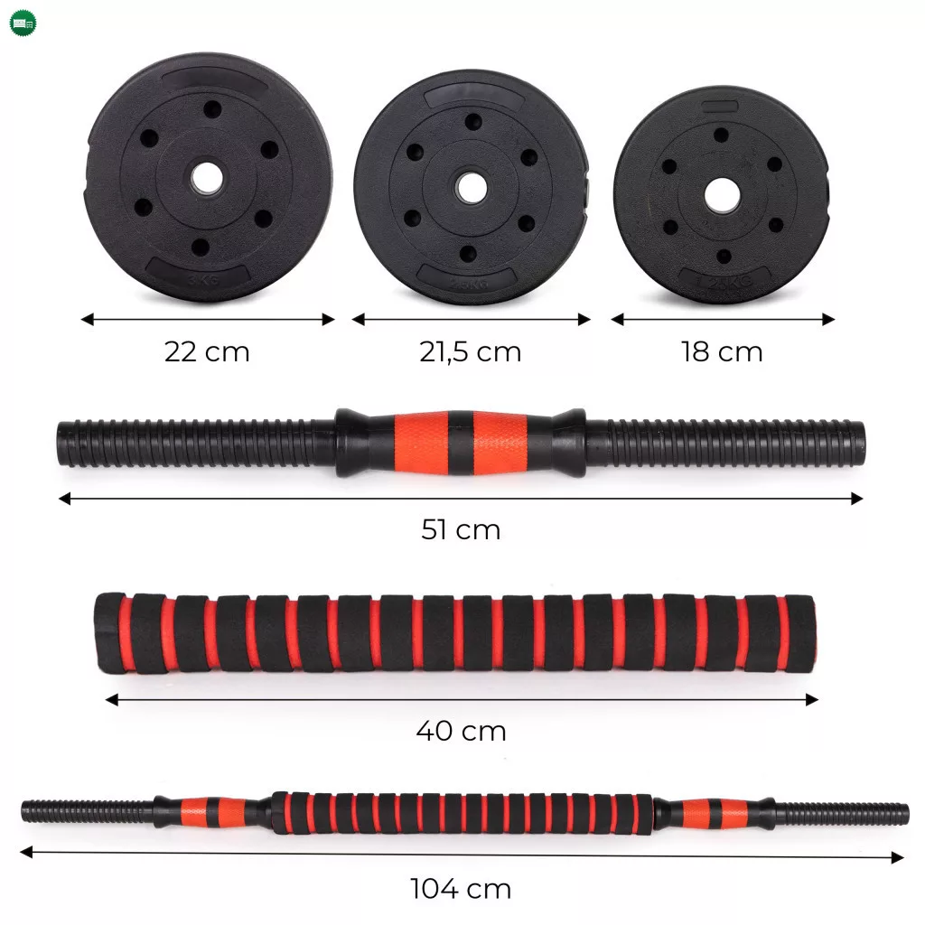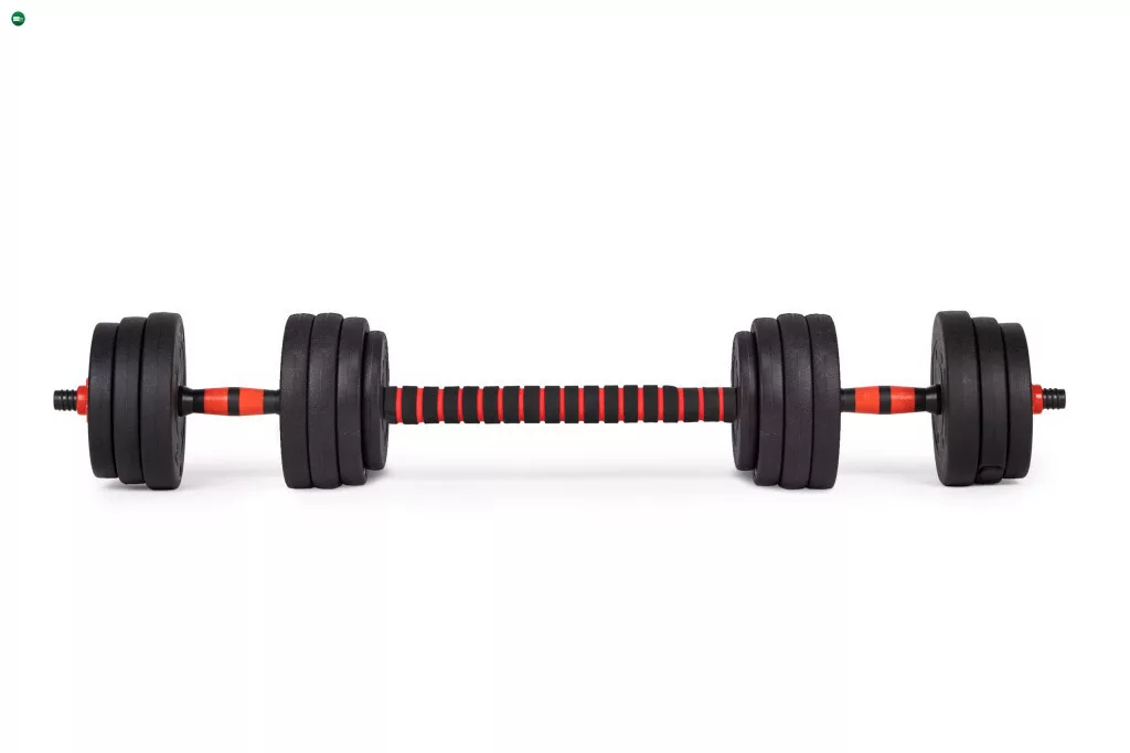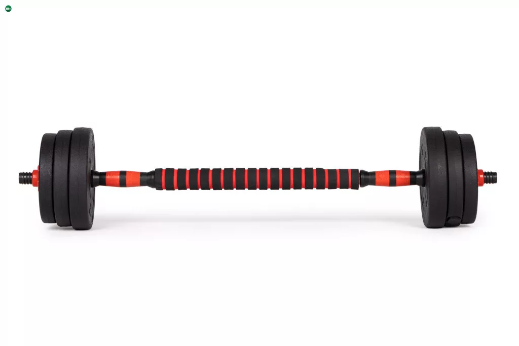 The set includes a special bar, which when assembled with two dumbbellscreates a functional barbell.