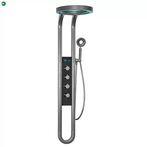 A zuhanypanel rozsdamentes acélból készült, amely garantálja a hosszú élettartamot és a prémium megjelenést. A grafitszürke szín modern eleganciát sugároz, amely bármely fürdőszobai környezethez illeszkedik.