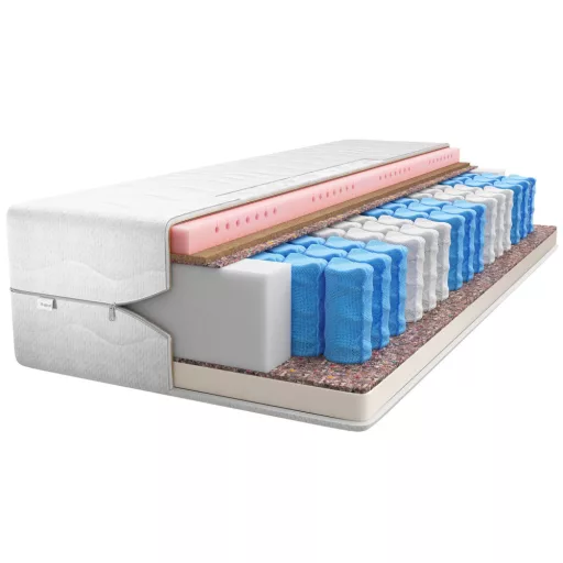 A matrac KÉTOLDALAS . A két felület használatának lehetősége jelentősen meghosszabbítja élettartamát. A matrac zsebrugókat használ, amelyek tökéletes alkalmazkodást biztosítanak a test formájához. Minden rugó külön zsebben található, aminek köszönhetően a rugók egymástól függetlenül reagálnak a nyomásra, így kiküszöbölve a rezgések átvitelét a teljes felületen. A matrac 7 keménységi zónával rendelkezik . A matrac a lábakon és a fejen puhább, belül pedig keményebb, ami megfelelő tartást garantál a gerincnek. Az egyik oldalon, a felső rétegen latex hab van . A latex porózus szerkezete megfelelő szellőzést biztosít. A latex természetesen hipoallergén. A felhasználó súlyától függetlenül nagyon jól működik. Ortopédiai tulajdonságokkal rendelkezik . A másik oldalon, a felső rétegen egy rendkívül rugalmas , deformációnak ellenálló, rugalmas és a terhelés eltávolítása után dinamikusan reagáló habot használtak . Az RLK hab szerkezete aktív szellőzést garantál a matrac belsejében, csökkentve a túlzott izzadás problémáját. Az RLK habréteg alatt egy kókuszszőnyeg réteg található , amely tökéletesen stabilizálja és merevíti a matrac szerkezetét. A kókuszrostok antibakteriális tulajdonságokkal rendelkeznek, és gátolják a gombák és penészgombák növekedését. A kókuszszőnyeg támogatja a megfelelő keringést a matracban.