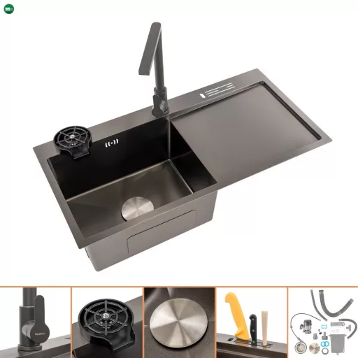 A felület nano technológiás bevonata ellenáll a zsírfoltoknak, vízkőnek és szennyeződéseknek. A fekete-bronz szín mélységet és eleganciát kölcsönöz a mosogatónak, a speciálisan csiszolt felület pedig karcálló, így hosszú távon is megőrzi újszerű megjelenését.