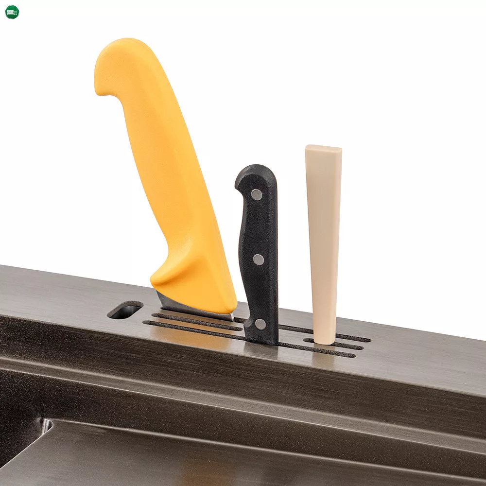 - Beépített késtartó (késcsurgató) – Higiénikus és biztonságos késtartási lehetőség, közvetlenül a mosogatónál.
