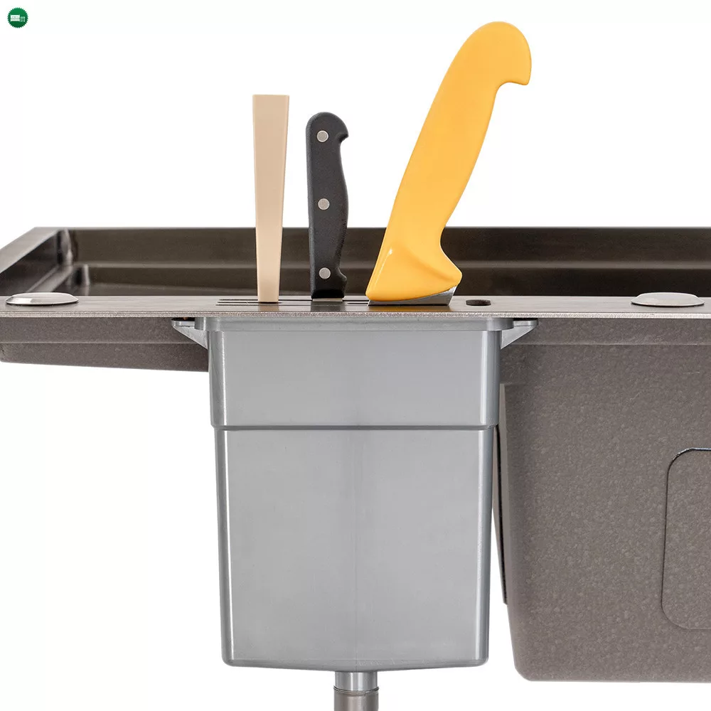 - Praktikus késtartó ("késcsurgató") – Az egyedülálló beépített késtartó lehetővé teszi a kések higiénikus és biztonságos tárolását közvetlenül a mosogatónál, így mindig kéznél lesznek, amikor szüksége van rá.