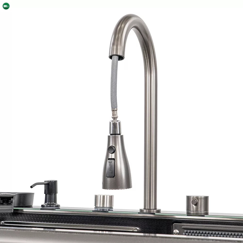 • Zuhanyfejes kihúzható csaptelep: nagyobb edények és tálcák tisztításához is tökéletes.