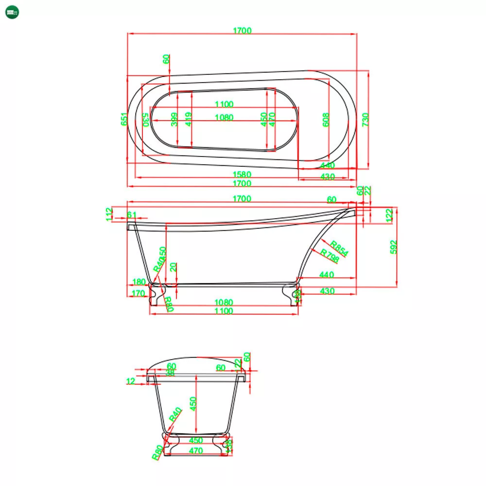 Clark szabadon álló fürdőkád fém lábakkal – 170x73x73 cm