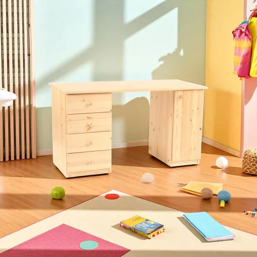 Elegáns, klasszikus hatású tömör fenyő íróasztal, skandináv borovi fenyőből, mérete: 132 × 74 × 62 cm.