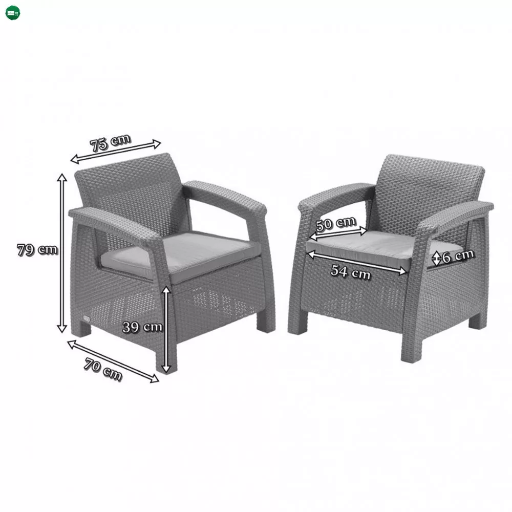 Első pillantásra úgy tünhet, hogy a bútorok rattanból készültek, de valójában egy kiváló minőségű müanyagból hoztak létre, amely ellneáll a szélsőséges időjárási viszonyoknak. Lapos párnák, széles kartámaszok és kontúros háttámlák biztosítják a kényelmet a kerti székek használatakor. A bútorgyártó a Curver márka, amely kiváló minőségű kerti bútorokat készít fröccsöntött műanyagból. Egy csoportban működik a közismert és népszerű Keter és Allibert márkákkal Lengyelországban. A korfu bútorokat a vállalat magyar gyárában gyártják. Az egységes szín és a formatervezés a Corfu sorozaton belül lehetővé teszi a Corfu Duo fotelok használatát a sorozat többi készletének kiegészítéseként.