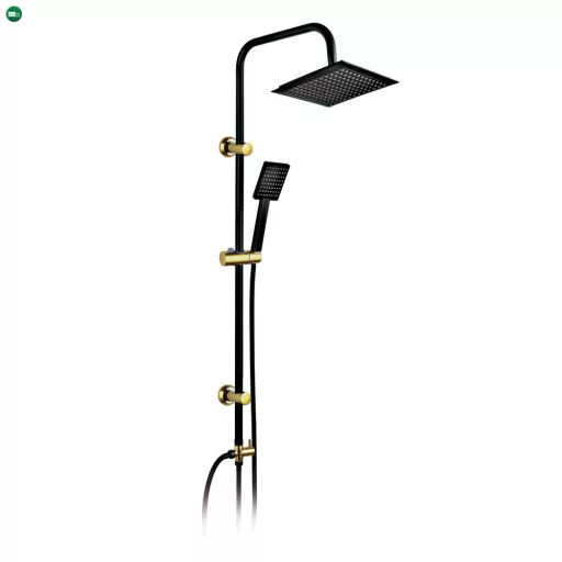 Az aranyszínű kiegészítőkkel ellátott fekete zuhanykészlet mérete 110 x 20,5 x 48 cm. A zuhanyon beállíthatja a rögzítőkonzolok távolságát 30 és 80 cm között. A Denis 63 zuhanykészlet tartós és sérülésálló 150 cm hosszú tömlővel és fogantyúval van felszerelve, amely lehetővé teszi a kézibeszélő kényelmes felakasztását. A készletben található zuhanyfej és esőzuhany egy típusú fúvókával rendelkezik. A Denis 63 zuhanykészlet elegáns, négyzet alakú esőzuhanyfejjel rendelkezik, arany színben. Méretei 20x20 cm.