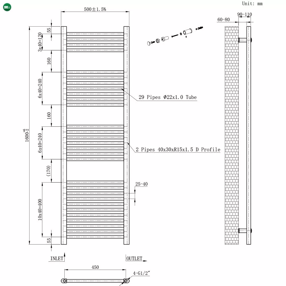 A 1600x500 mm-es méret nagyobb szárítófelületet kínál, így egyszerre több törölköző vagy textília is kényelmesen elhelyezhető rajta. Az egyenes csövek rendezett megjelenést kölcsönöznek, miközben megkönnyítik a törölközők felhelyezését és levételét. Kompakt mérete miatt könnyen illeszthető különböző fürdőszobai elrendezésekhez, így ideális választás családi házakba és tágasabb lakásokba is.