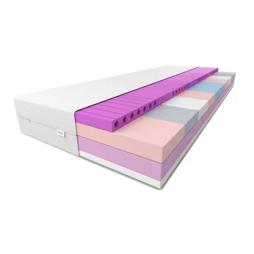 A matrac KÉTOLDALAS . A két felület használatának lehetősége jelentősen meghosszabbítja élettartamát.A matrac HR zónaréteget használ , amely rendkívül rugalmas habok és fokozott keménységű habok kombinálásával készült. A 9 keménységi zónából álló terület olyan megoldás, amely lehetővé teszi a felhasználó alakjához való tökéletes alkalmazkodást A matrac fokozott keménységű habszivacsból készült aktívan stabilizáló réteggel rendelkezik , amely szerkezetének köszönhetően garantálja az optimális egyensúlyt és a hosszú távú tartósságot. teljes szerkezet. Az egyik oldalon, a felső rétegen nagy rugalmasságú habot használtak , amely ellenáll a deformációnak, rugalmas és dinamikusan reagál a terhelés eltávolítása után. Az RLK hab szerkezete aktív szellőzést garantál a matrac belsejében, csökkentve a túlzott izzadás problémáját. A másik oldalon megnövelt keménységű habot használtak a gyártás során , amelyet nagy rugalmasság jellemez. A felület megfelelő tartást biztosít a gerincnek. A matracban felhasznált anyagok hipoallergének, megfelelő környezetet biztosítanak az allergiásoknak.