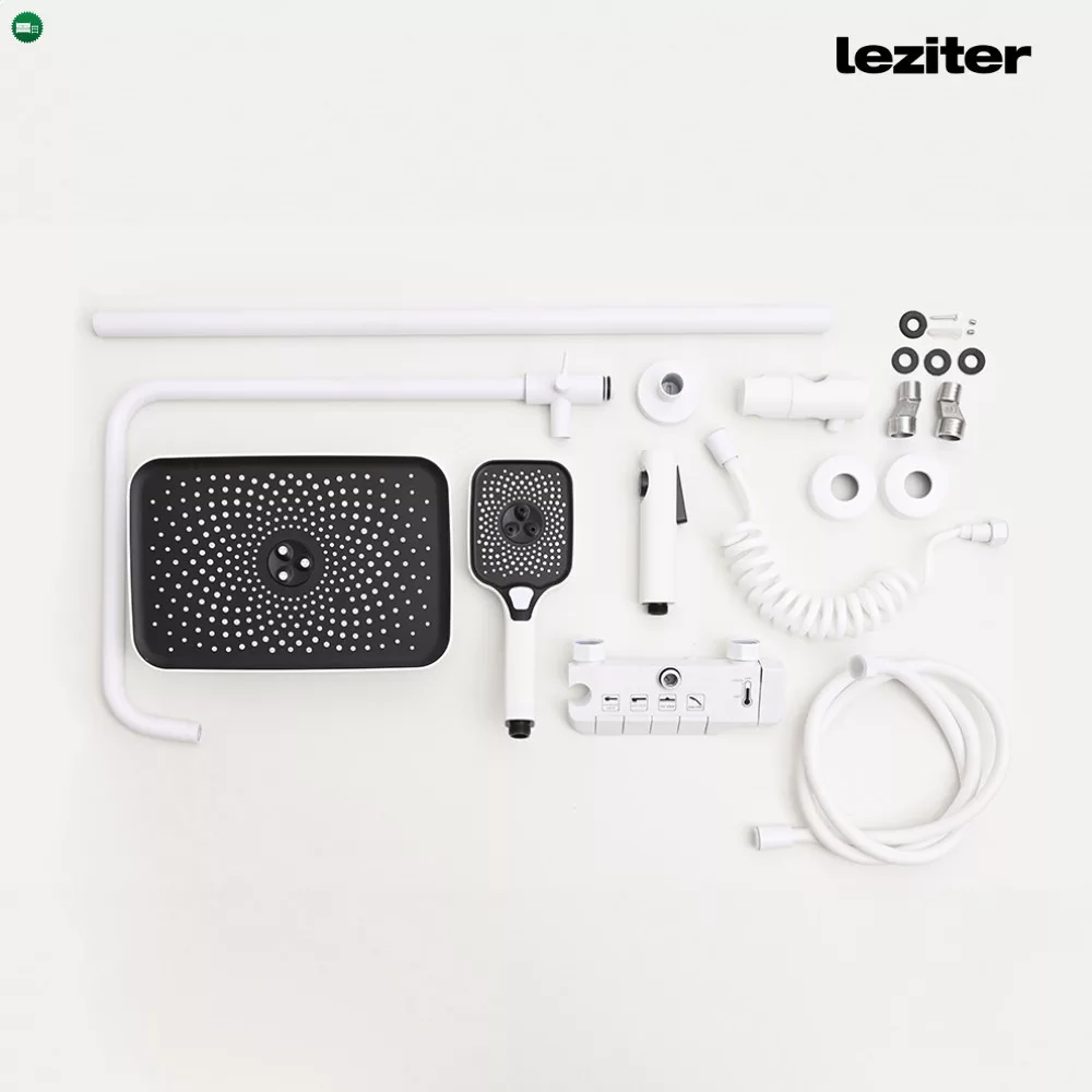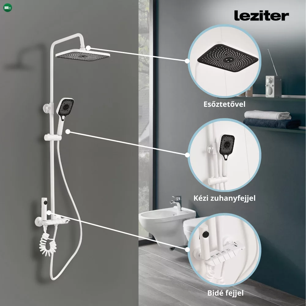 Az Eliz multifunkciós zuhanyszett a Leziter prémium kategóriájú modellje, amely a design, a funkcionalitás és a kényelem tökéletes egyensúlyát kínálja. A modern fehér árnyalat és a letisztult formák elegáns megjelenést kölcsönöznek bármilyen fürdőszobának, miközben a sokoldalú funkciók gondoskodnak a személyre szabott zuhanyélményről.