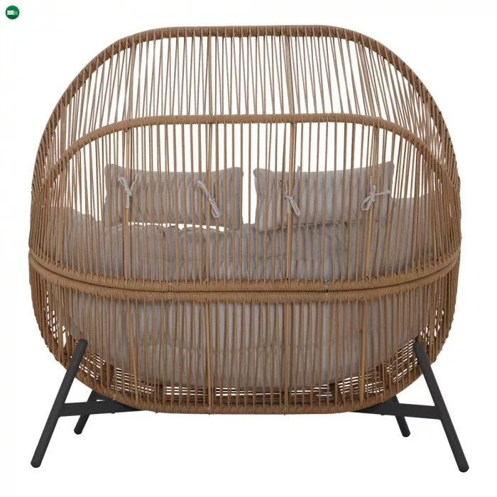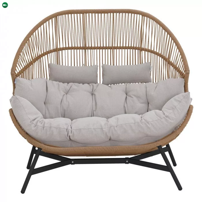2 személyes kerti fotel, mely a nagy kosárfelületnek köszönhetően bármilyen pozícióban kényelmes pihenést tesz lehetővé. A mély polirattan szövésű ülés tökéletes kültéri használatra, mivel ez az anyag jobban ellenáll a kedvezőtlen időjárási viszonyoknak. A bútor stabilitásának és tartósságának megőrzése érdekében a fotel váza porszórt acélból készül, melyre a nagyobb korrózióállóság jellemző. Az ülésen nagyméretű, sodrott poliészter párna található. Ez az anyag ellenáll a nedvességnek és gyorsan szárad, így ideális kültéri használatra.