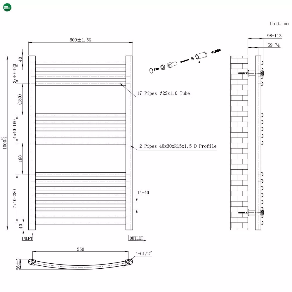 A 1000x600 mm-es méret ideális arányt kínál: kellően nagy ahhoz, hogy hatékony hőleadást biztosítson, ugyanakkor kompakt marad, így kisebb és közepes alapterületű fürdőszobákban is könnyen elhelyezhető. Az íves csövek ergonomikus kialakítása megkönnyíti a törölközők fel- és levételét, a nagyobb csőszám pedig fokozza a hőleadó felületet, ezáltal a szárítás hatékonyságát is.