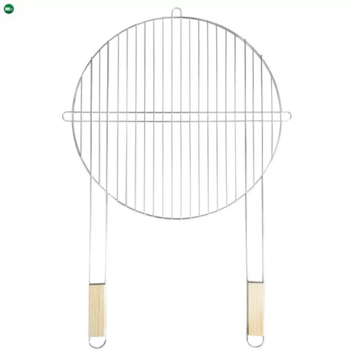 Nagyméretű kerek grillrács dupla fa fogantyúval a könnyű használat érdekében. Tökéletes különféle ételek grillezéséhez.