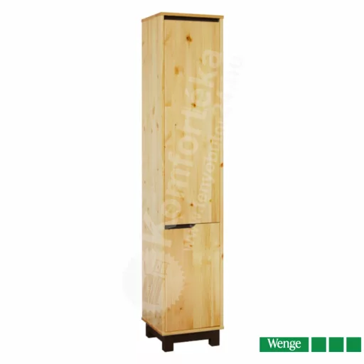 A Lexa szekrény 1+1 ajtós polcos keskeny jobbos változata tökéletes megoldást kínál szűkebb helyiségekbe. Fogantyú nélküli és modern stílusa letisztult megjelenést kölcsönöz a térnek, míg a tömör fenyőből készült anyaga melegséget és természetességet sugároz. A polcos belső elrendezés lehetővé teszi különböző tárgyak rendezett tárolását. Kérhető lakkozattal és választható színekkel rendelhető, beleértve a szürke, fehér, dió és wenge árnyalatokat is. A zsanér elhelyezése kérhető, hogy a legjobban megfeleljen az Ön igényeinek és térbeli elrendezésének.