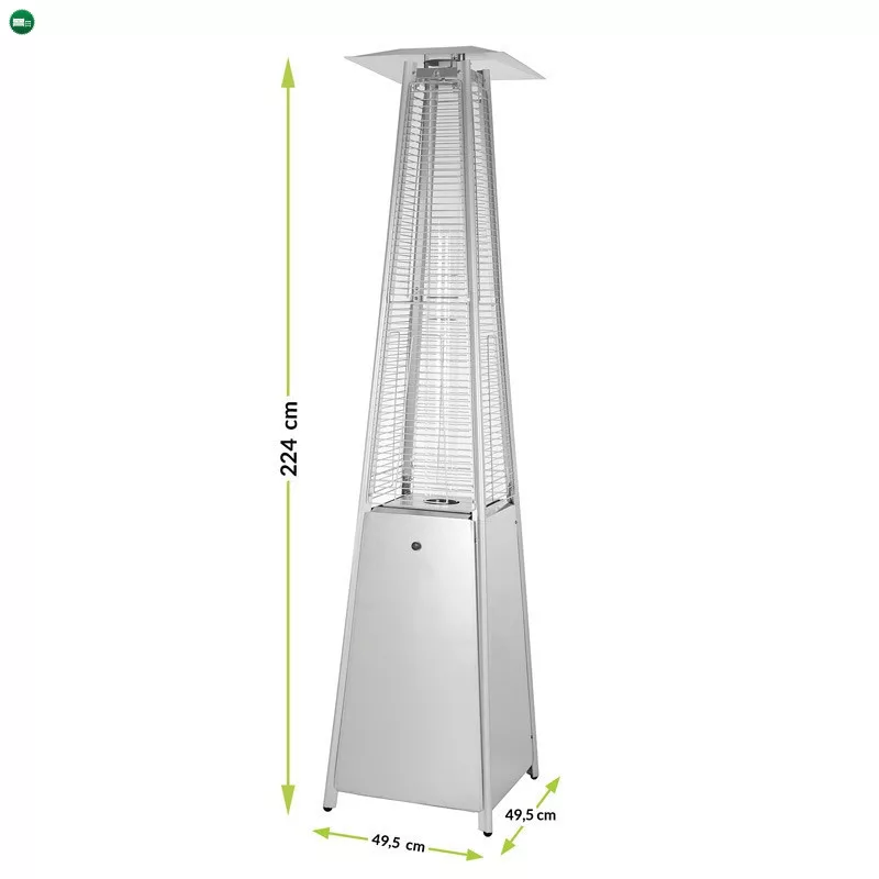 A magas gázmelegítőnek van egy lombkoronája, amelynek átmérője legfeljebb 49,5 cm, ennek köszönhetően a reflektor 25m² felület melegítését teszi lehetővé.