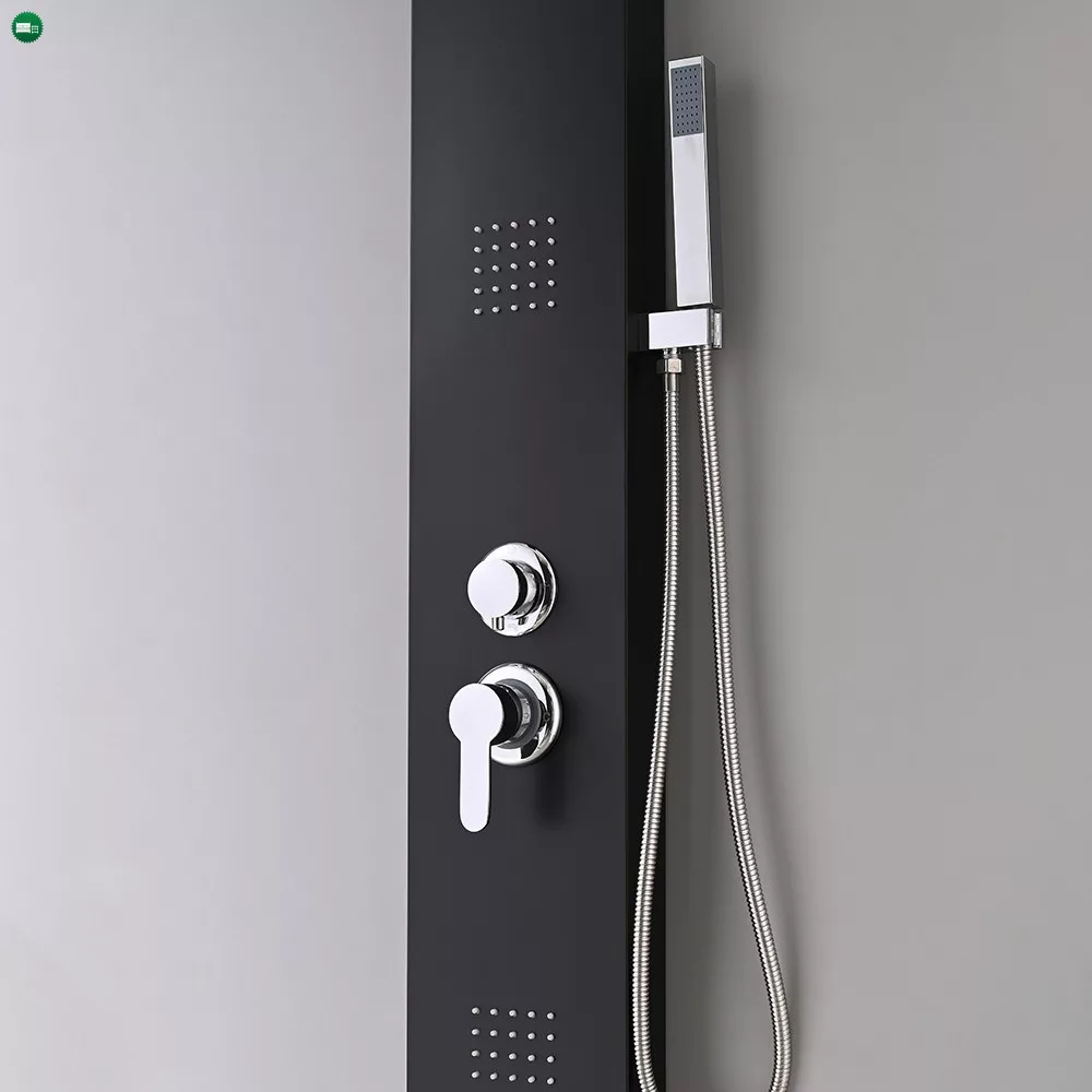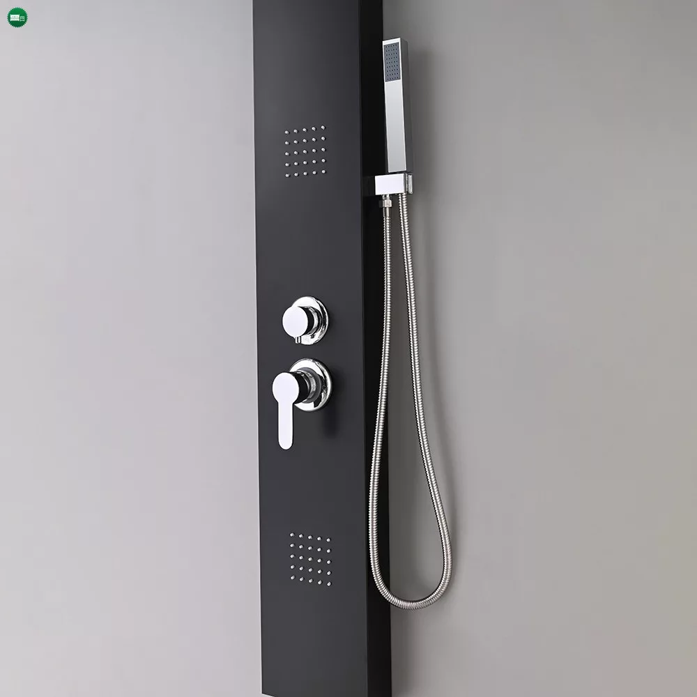 A zuhanypanelhez tartozik egy kézi zuhany is, amely lehetővé teszi a célzott vízsugarak irányítását és a test bármely részének alapos tisztítását. A rozsdamentes flexibilis zuhanygégecső hossza 1,5 m, amely elegendő mozgásszabadságot biztosít a zuhanyozás során. Ez a tartós és kényelmes zuhanykiegészítő megkönnyíti a fürdést és a tisztálkodást. A Malaga Black hidromasszázs zuhanypanel sárgaréz betétes váltószeleppel és krómozott karral rendelkezik, amely lehetővé teszi a különböző víznyomás és hőmérséklet beállítását.