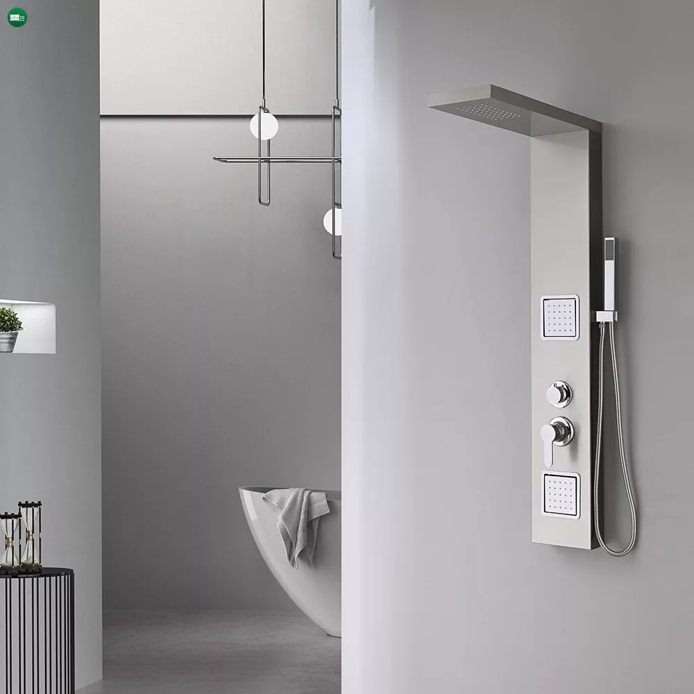 A zuhanypanel sárgaréz csapteleppel és cink fogantyúval van felszerelve, amelyek kiváló minőségű anyagokból készültek, biztosítva a hosszú élettartamot és a megbízható működést. A sárgaréz csaptelep lehetővé teszi a könnyű és pontos vízszabályozást, és a cink fogantyúval való könnyű kezelhetőség tovább fokozza a zuhany élményét. A zuhanypanel felső részén egy 45 cm-es esőztető található, amely pazar zuhanyszerű érzést kelt, mintha az eső frissítő cseppei zuhannának a testre. Az esőztető széles átmérője lehetővé teszi, hogy a víz széles körben eloszoljon, így tökéletes ellazulást biztosít a fürdés során.