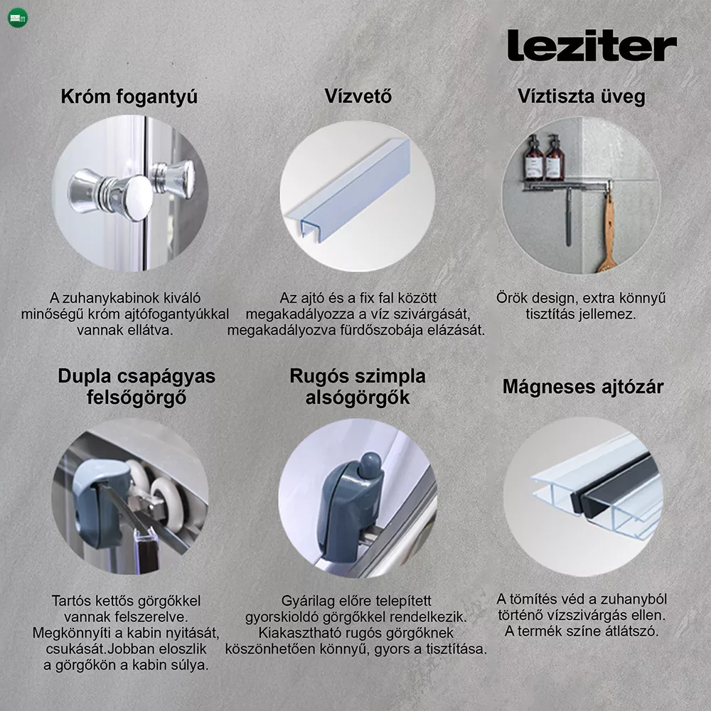 A zuhanykabin 4 mm vastag edzett biztonsági üveggel készül, amely ellenáll a mindennapi igénybevételnek. Törés esetén apró, tompa darabokra esik szét, így biztonságos választás családi környezetben is. A mélytálcás kialakítás stabil belépést és kényelmes használatot biztosít.