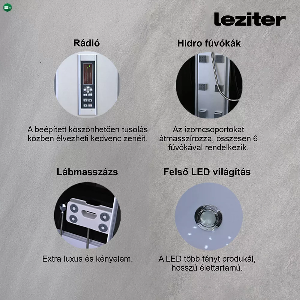 A beépített rádiónak köszönhetően zuhanyzás közben is hallgathatók kedvenc zenék vagy rádióműsorok. A felső LED világítás kellemes, hangulatos fényt biztosít a zuhanykabin belsejében, amely tovább erősíti a wellness élményt.