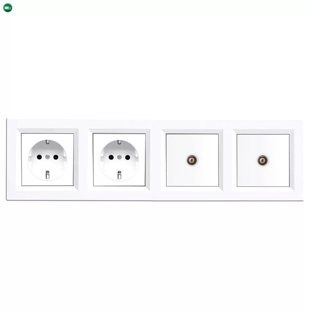 - Típus: 2× földelt csatlakozóaljzat (2P+F, F típus) + 2× TV (RF koaxiális) aljzat