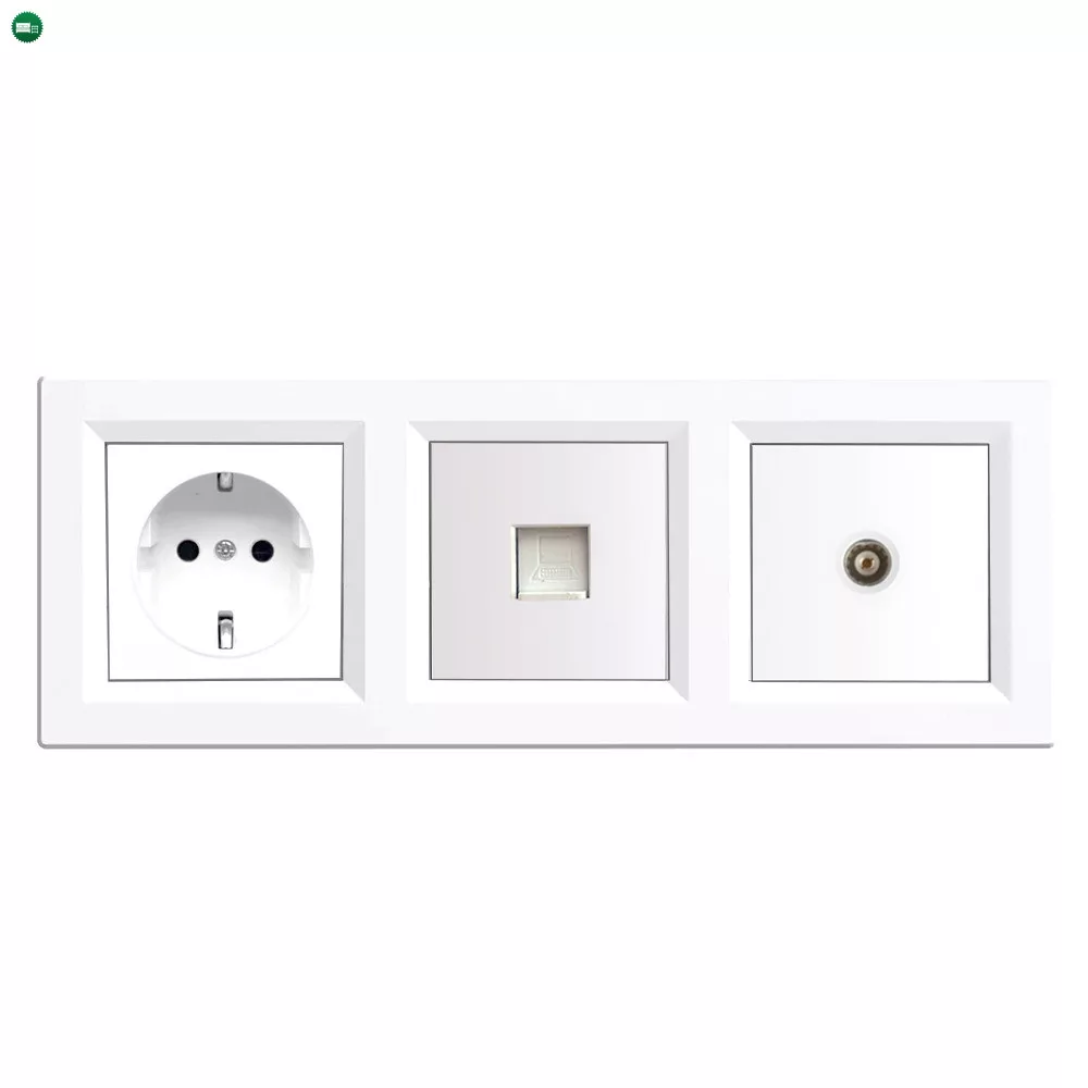 Nova hármas csatlakozóaljzat szett – földelt dugalj, UTP és TV aljzat egyben, letisztult fehér kerettel
