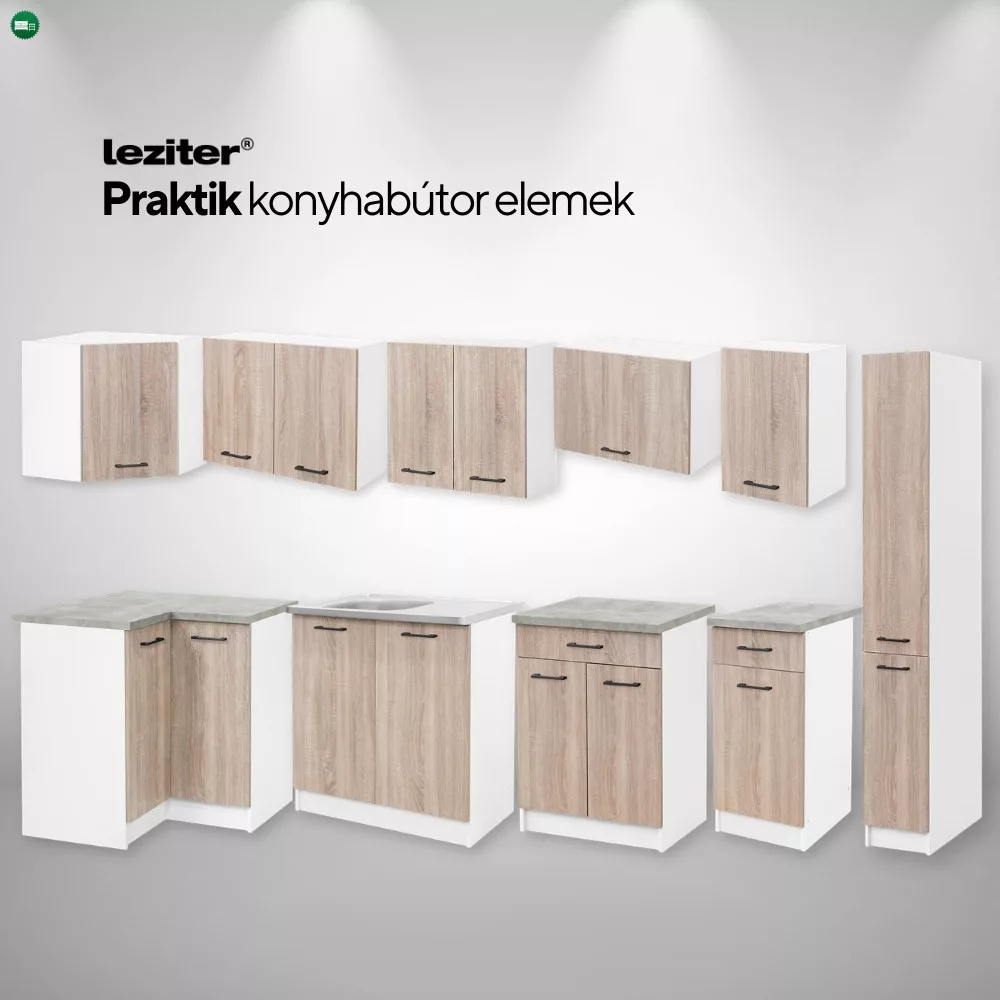 A Praktik 180 konyhabútor fehér korpusszal és sonoma tölgy fronttal illeszkedik bármilyen lakberendezési stílusba. Világos színvilága optikailag tágítja a teret, ezért ideális választás kisebb konyhákba, garzonokba és nyitott amerikai konyhás nappalikba is. Letisztult formája a mai modern otthonok kedvelt megoldása.
