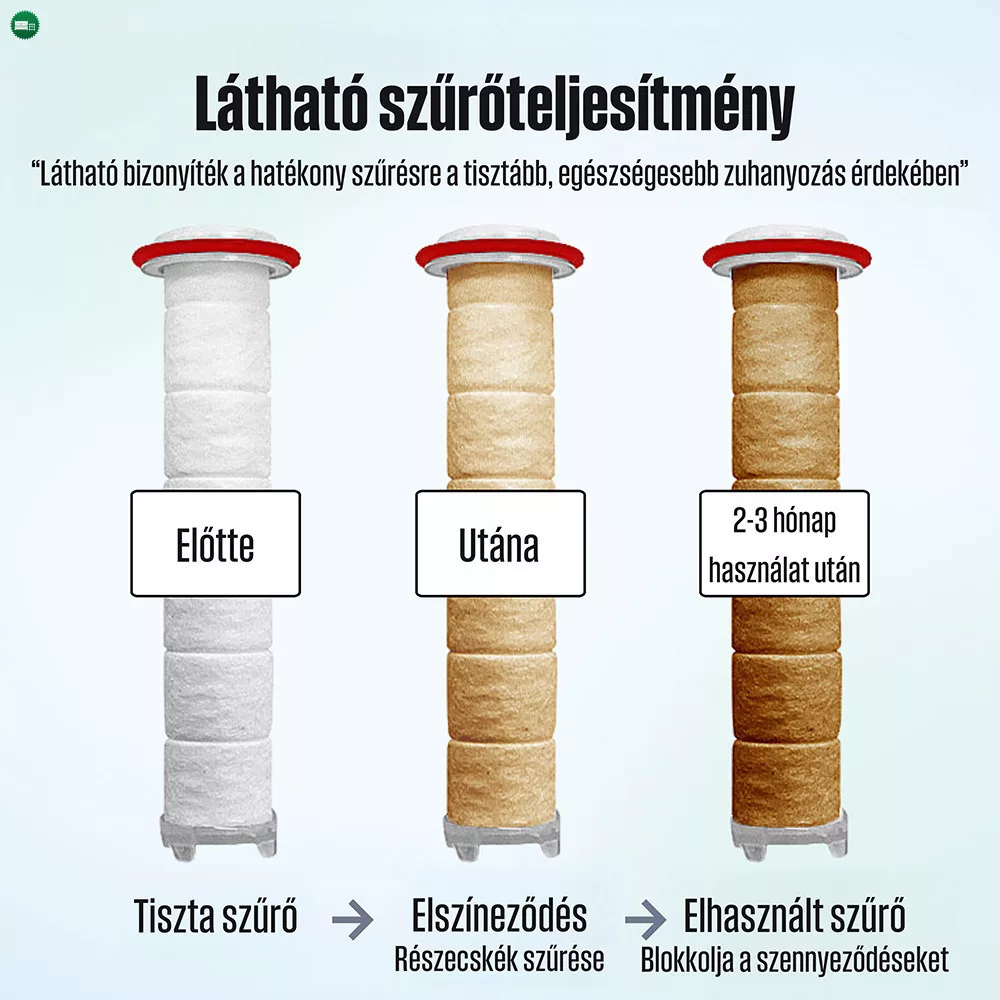 Ezek a mikroszemcsék jellemzően a hajon, a bőrön és a fejbőr pórusaiban rakódhatnak le, így a rendszeres szűrőcsere nemcsak a BT100® zuhanyfej teljesítményét, hanem a bőr és a haj egészségét is hosszú távon megőrzi.