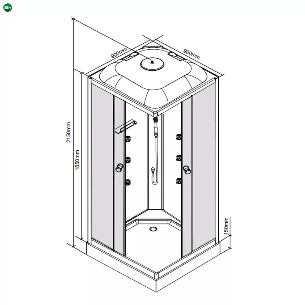 - Magasság: 185 cm (kabin), 215 cm zuhanytálcával együtt
