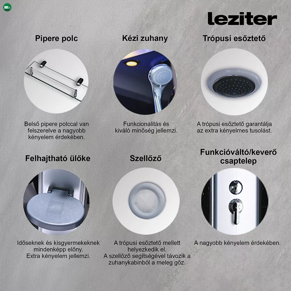 A zuhanykabin 6 hátmasszírozó fúvókával van felszerelve. Az alumínium hátsó panel és a beépített elektronika, kezelőpanel, rádió és hangszórók lehetővé teszik, hogy minden zuhanyzás egy igazi élménnyé váljon. A hátsó és felső hangulatvilágítás, valamint a felső világítás tovább fokozza a relaxációt, miközben a praktikus piperepolc és a lábmasszírozó gondoskodik a maximális kényelemről.